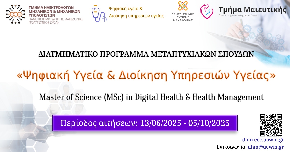 Τα τμήματα Ηλεκτρολόγων Μηχανικών και Μηχανικών Υπολογιστών και Μαιευτικής του Πανεπιστημίου Δυτικής Μακεδονίας καλούν τους ενδιαφερόμενους να υποβάλουν υποψηφιότητα για την παρακολούθηση του εγκεκριμένου Προγράμματος Μεταπτυχιακών Σπουδών το οποίο οδηγεί στην απονομή Διπλώματος Μεταπτυχιακών Σπουδών (ΔΜΣ-Master) «Ψηφιακή Υγεία & Διοίκηση Υπηρεσιών Υγείας (Digital Health & Health Management)»